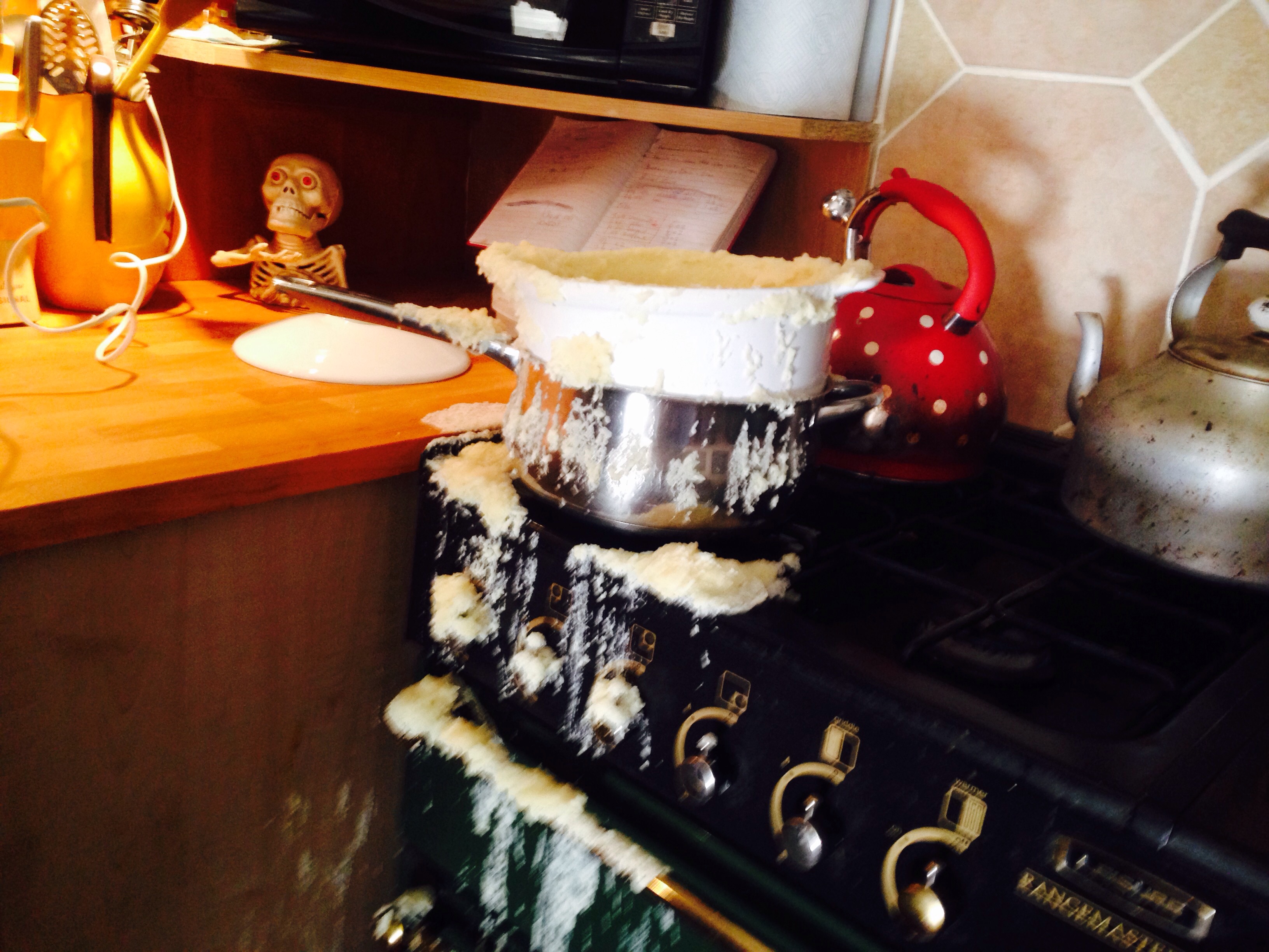 It was as if I was frozen. I couldn’t think of a thing to do. I stood and gasped as thick white goo plopped about all over my stove.