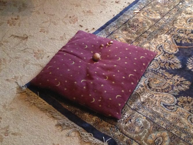 When Mark got up this morning he discovered that he had been in the bowl of nuts and and carefully arranged nuts in strategic places everywhere. Some had been chewed up as a surprise for bare feet, some had just been artistically placed, like the one in the picture, for which he had arranged the cushion especially, and several had been buried in the rug in my office.