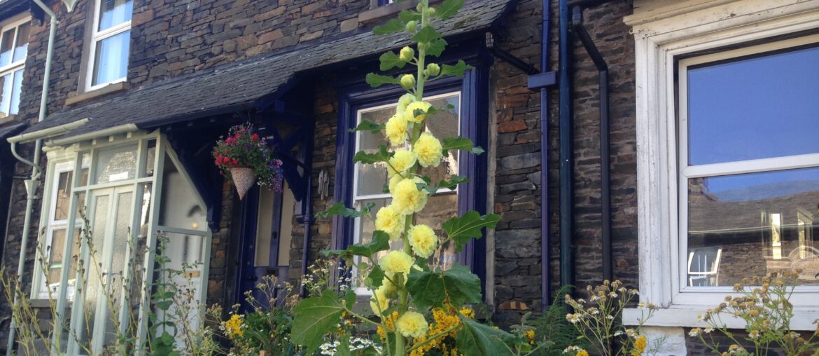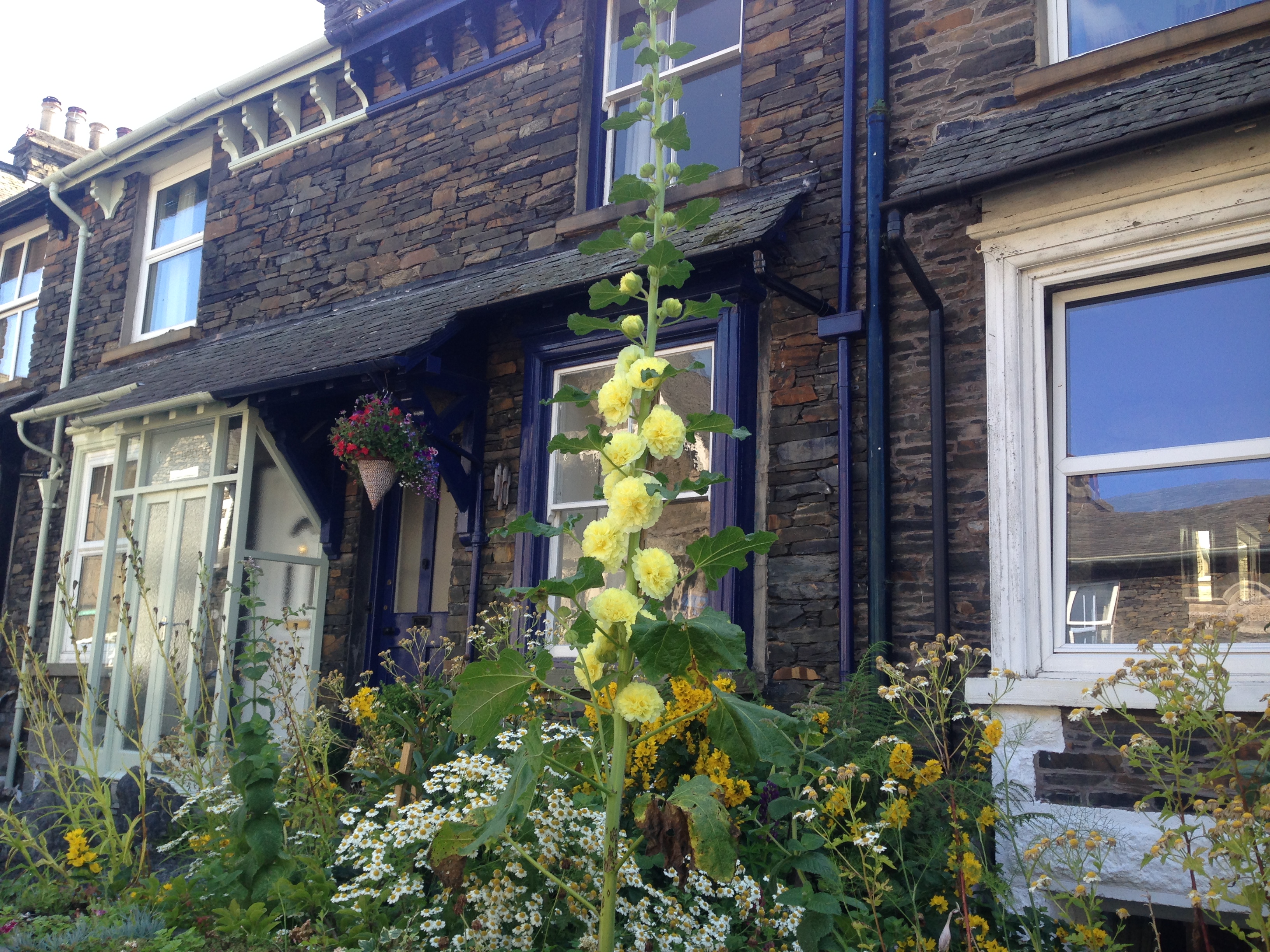 I haven’t taken a picture of the dogs. Have a picture of the front garden. The giant thing is something grown from a tiny seedling my mother gave me. I had thought it was a delphinium, but now I am not sure. It is about eight feet tall.