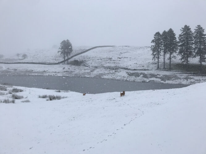 The world was almost utterly silent. Not a bird squeaked, presumably they were sitting in barns with their heads under their wings, like in the rhyme. I could hear the snow creaking under my feet, and the distant sound of the beck in the dip, but apart from that, nothing.