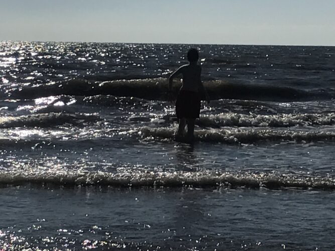 His father does not like getting his paws wet, and picked his way grumpily along behind us, refusing to follow us into the sea and grumbling to himself the whole time.