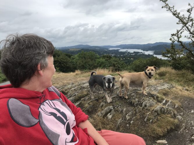 Have a picture of some dogs on the fell. That is Windermere in the distance.